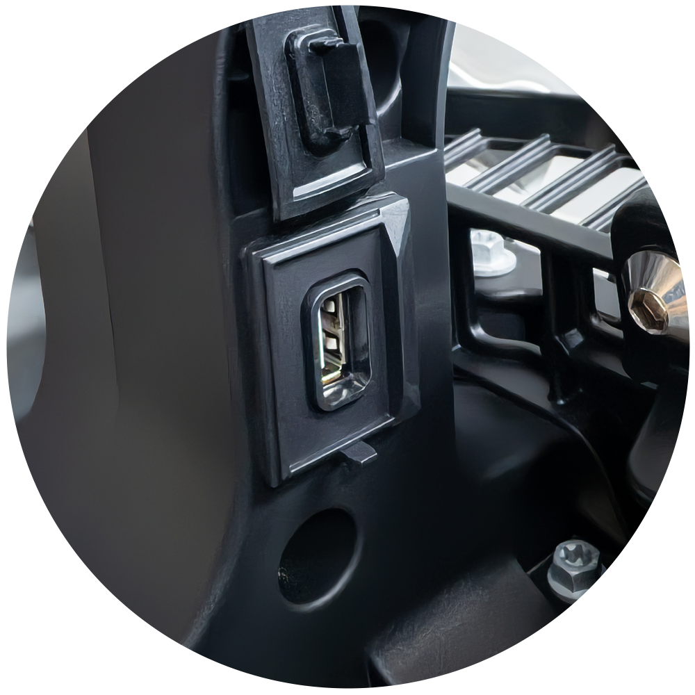 Incorpora una toma de carga USB perfectamente integrada en la zona de navegación, diseñada para alimentar dispositivos como móviles o equipos de roadbook.